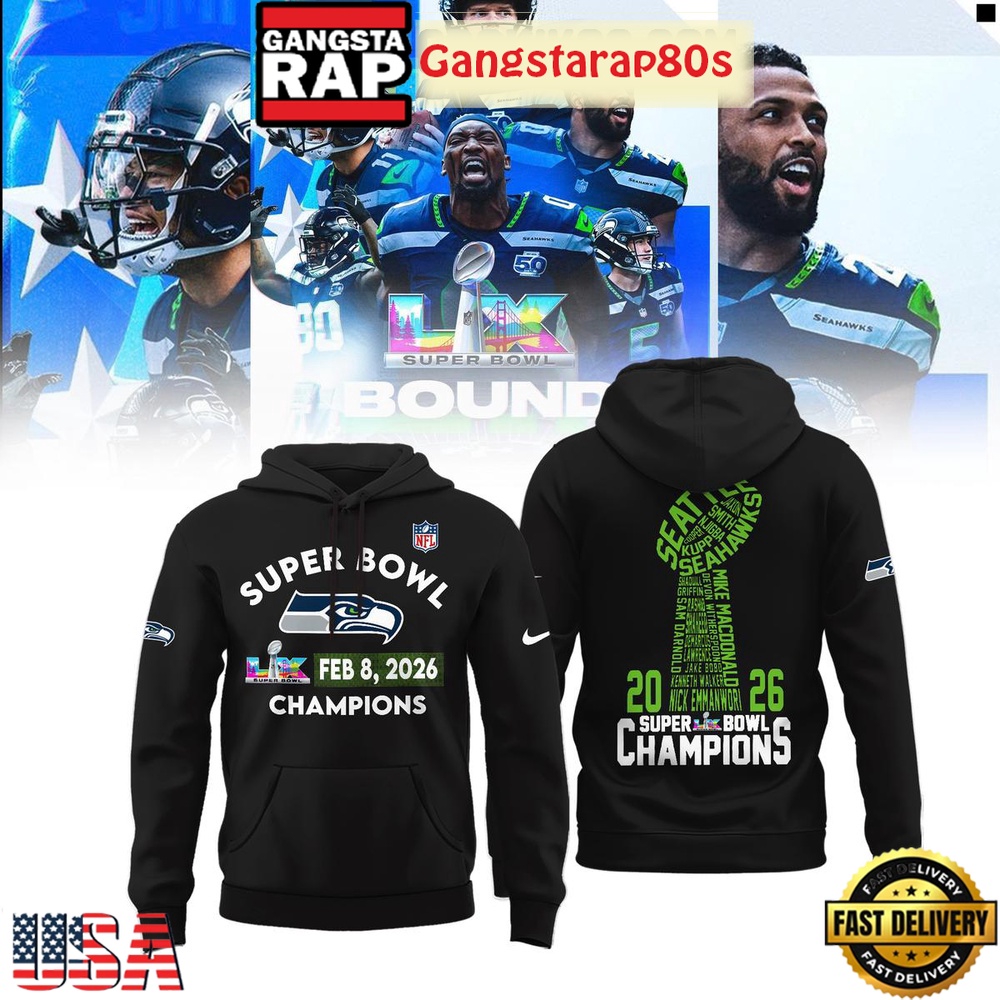 Photos Of Seattle Seahawks 2026 Champions Super Bowl LX Black Hoodie Shirt