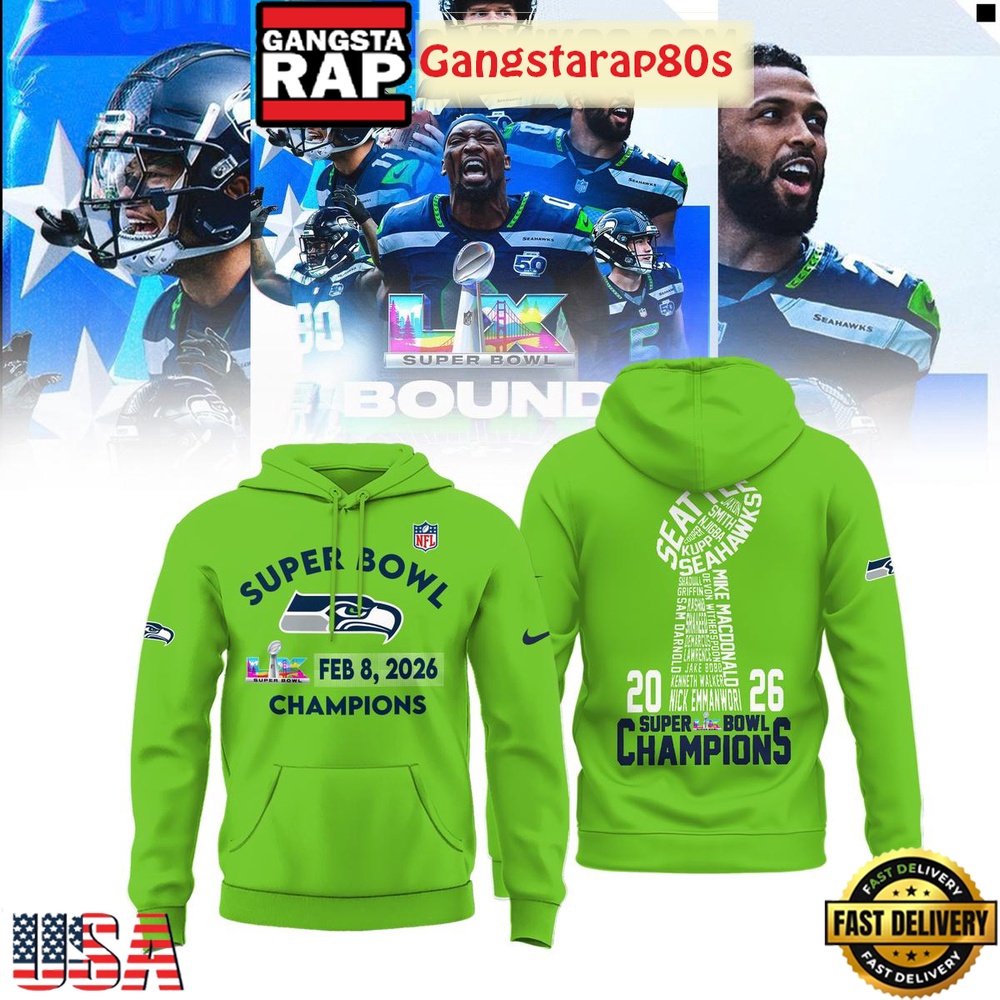 Photos Of Seattle Seahawks 2026 Champions Super Bowl LX Green Hoodie Shirt