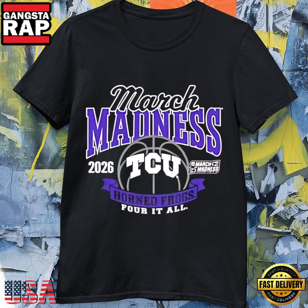 Texas Christian University Women’s Basketball 2026 March Madness Four It All Fan T-Shirt Introducing our 2D Shirt, a unique blend of style and creativity. Crafted from high-quality fabric, this shirt features a captivating 2D graphic design that adds a bold statement to your wardrobe. With its vibrant colors and intricate details, it offers a modern twist on classic apparel. Elevate your fashion game with our 2D Shirt, designed to turn heads and express your individuality in style.