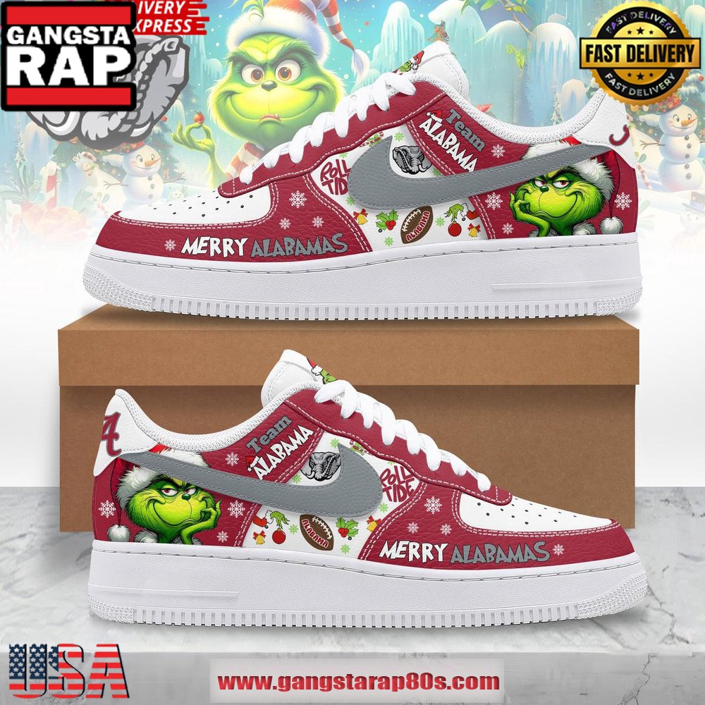 Don’t miss the opportunity to own a piece of this unique collaboration. These sneakers are tailored for sneakerheads, Alabama Crimson Tide fans, and those who revel in the joy of the holiday season, making them the ultimate gift or personal indulgence. With their distinctive design and cultural significance, the Grinch x Alabama Crimson Tide Limited Air Force 1 Running Sneakers are set to be a conversation starter and a cherished piece of footwear history.