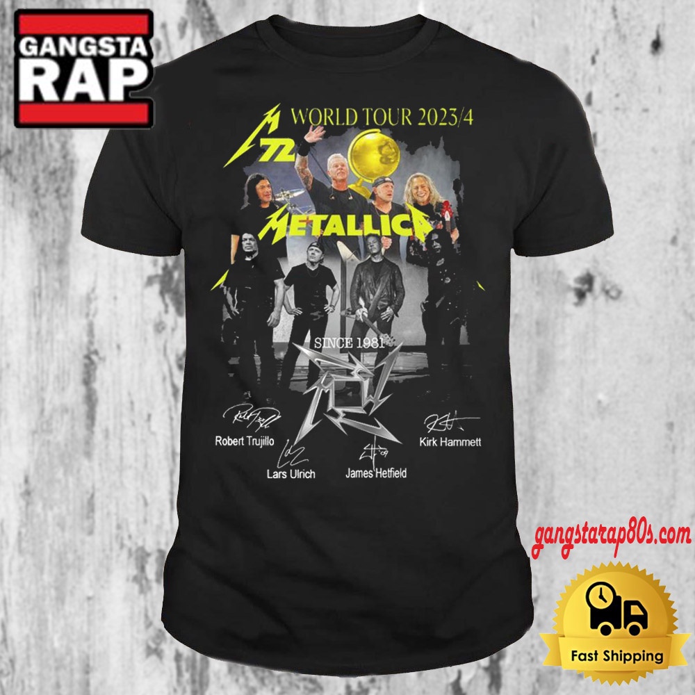 World Tour 2023 2024 Metallica Since 1981 Signature T Shirt Introducing our 2D Shirt, a unique blend of style and creativity. Crafted from high-quality fabric, this shirt features a captivating 2D graphic design that adds a bold statement to your wardrobe. With its vibrant colors and intricate details, it offers a modern twist on classic apparel. Elevate your fashion game with our 2D Shirt, designed to turn heads and express your individuality in style.